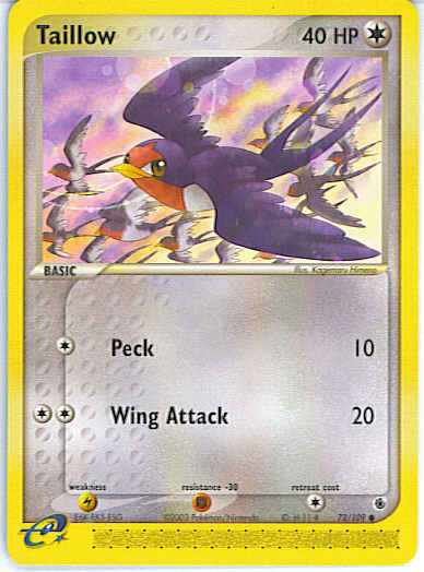 | Type | Colorless | | Pokemon serie | Ruby Sapphire | | Stadie | Basic | | HP | 40 | | Sjældenhed | Common | | Tilbagetrækning | 1 | | Modstand | F | | Svaghed | L | | Kortnummer | 72 | | Evne | [C] Peck (10) [CC] Wing Attack (20)